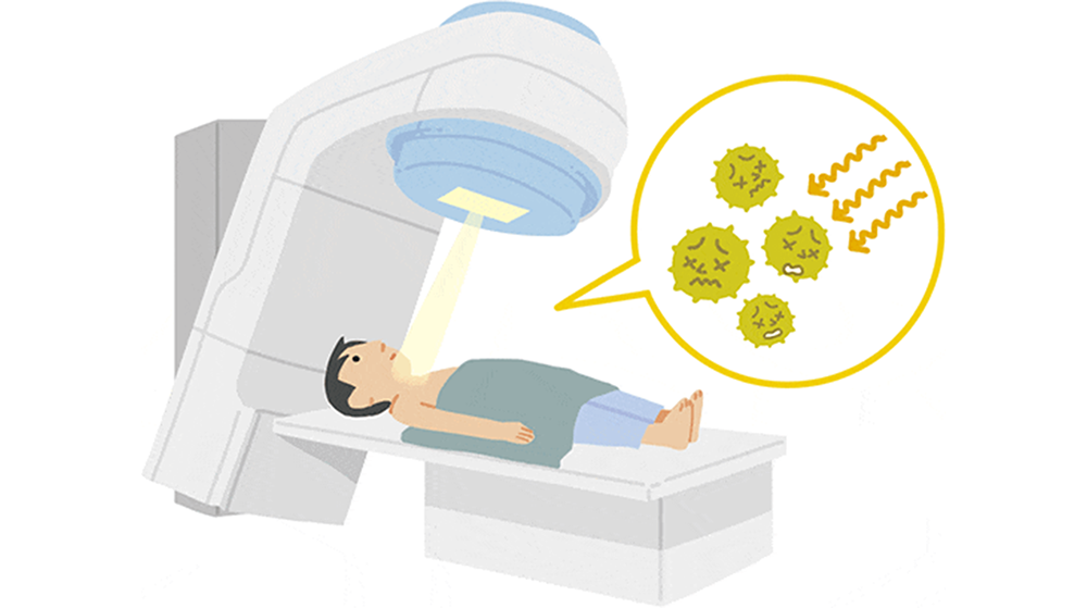 次は④放射線治療です。放射線治療はがんに放射線を当てて、がん細胞を壊す治療法になります。手術のように体を切らずに治療できます。事前にCTで計画をたてて、健康な部分がなるべく当たらないように計算します。放射線治療は「正確さ」が命になります。ミリ単位で位置を合わせて、毎回同じ条件で照射することが重要になってきます。