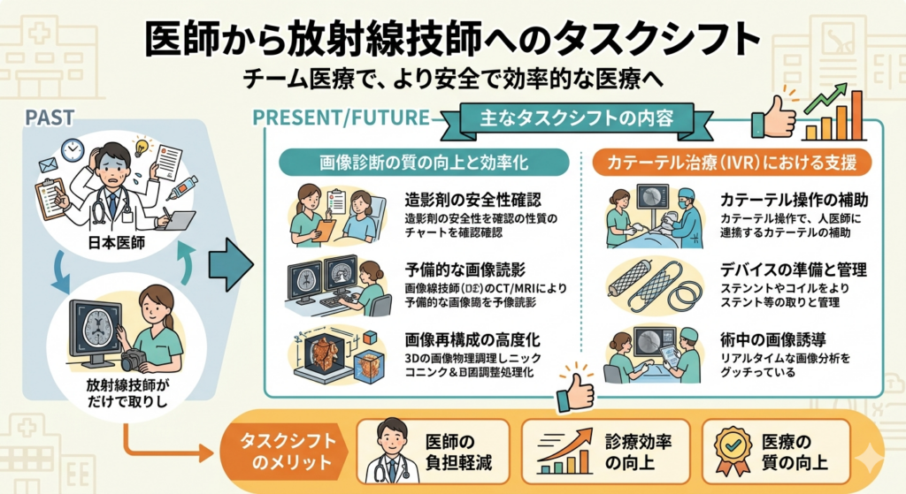 医師の残業時間が調整された裏側で、そのシワ寄せが僕たち放射線技師にも「タスク・シフト」という名目で流れてきています。 「造影剤の注入」から「カテ室での穿刺補助」まで。 今日は、放射線技師の僕が見た、2026年現在の「タスク・シフトの光と影」を具体的にお話しします。